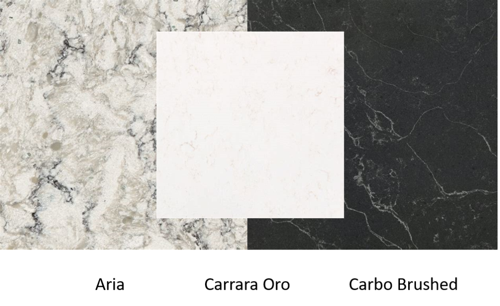 We have 3 quartz colors on sale: LG Viatera in Aria, Carrara Oro, and Carbo Brushed.